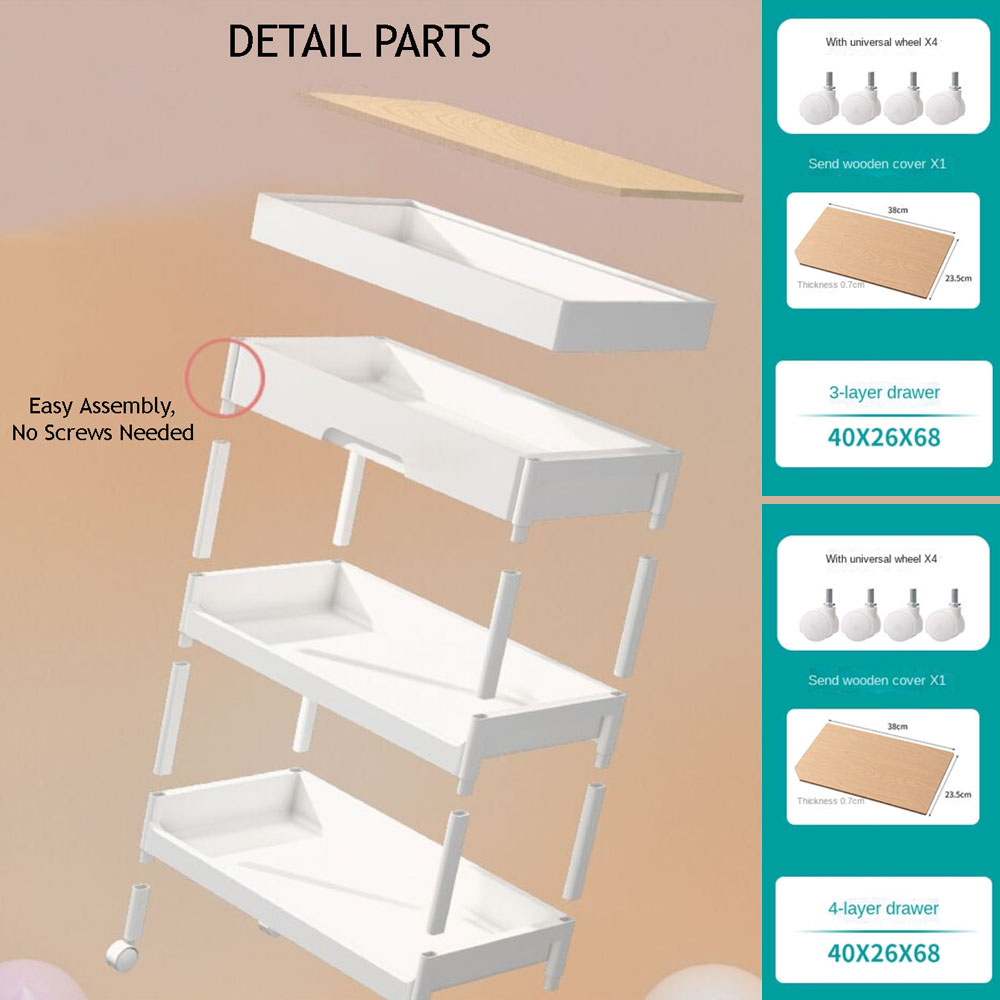 Accessories: Wheels (no brakes) x 4pcs + drawer x 1pc + wooden plate x 1pc